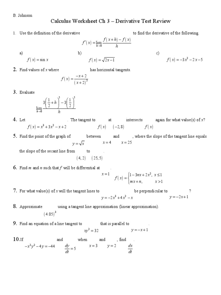 Worksheet Trig Derivatives | Sine | Trigonometric ... from imgv2-1-f.scribdassets.com Definition of the derivative … 1) f (x) = x 4 2) f (x)= x' Finding derivatives using the limit definition purpose. If the derivative does not exist at any point, explain why and justify your answer. H t t t2 2 3 6 4. 201 103 re calculus 1 worksheet. You may find it a useful exercise to do this with friends and to discuss the more difficult examples. S t t t3 24 5.
